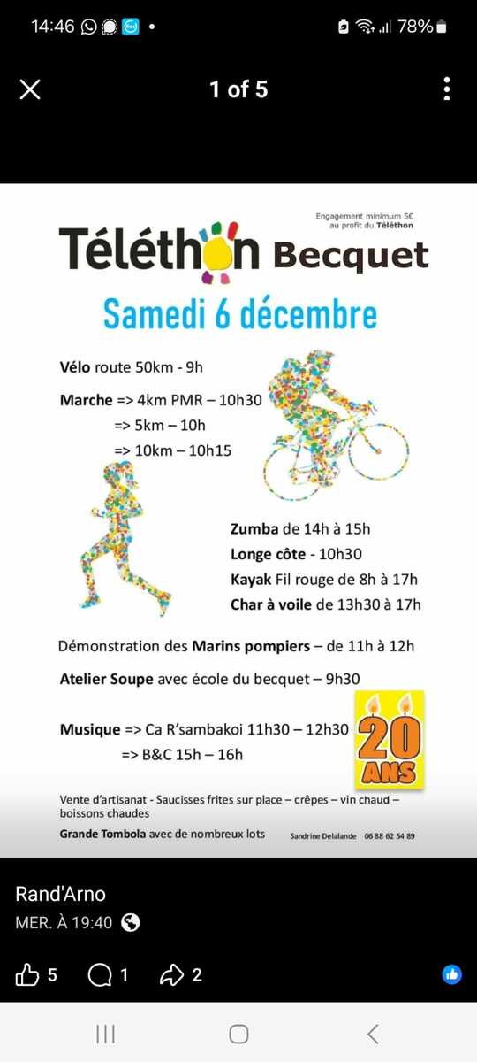En lien avec l'association Telethon Becquet - Rendez-vous le samedi 6 décembre à 9h au Becquet pour un parcours d'environ 50 kms